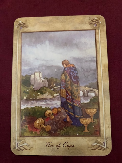 Today’s Card is the Five of Cups. This card is telling us that it’s ok to feel all things, the good and the bad. Cups are emotions. The man is focusing on three spilled cups. He is dressed warmly in a beautiful blanket, on a beautiful embankment with a nice bridge and castle across the way, and he has two upright cups behind him that he is choosing not to notice. It’s ok, because he will eventually. The number 5 signifies change, curiosity, distraction and having experiences. He is allowing himself to be distracted momentarily by something that saddens him. He is allowing himself to experience this moment. But by his very nature, he will not linger long. To feel joy, you must feel it’s opposite. It’s all good as long as you don’t sit in emotional sadness for too long.